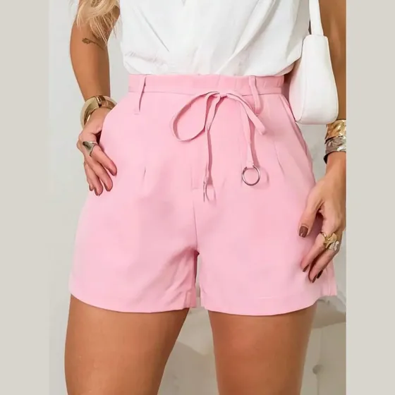 Short Feminino Cintura Alta Com Cordinha Alfaiataria Bolso
