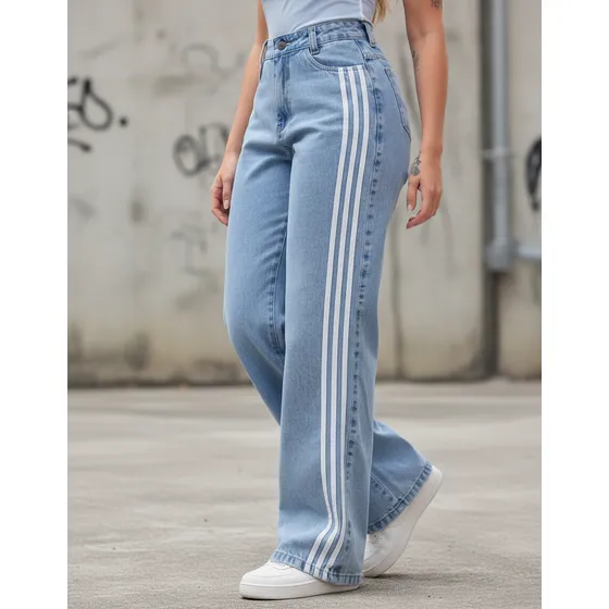 Calça Wide Feminina Listras Laterais Cintura Alta Streetwear