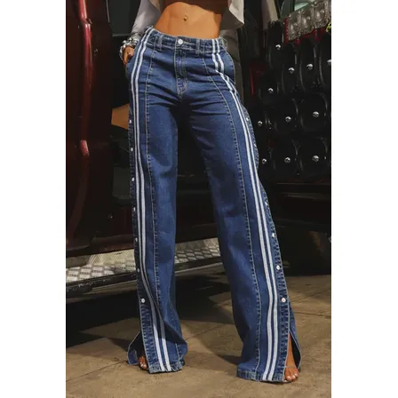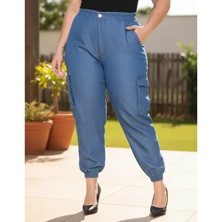Calça Jeans Wide Bolsos Laterais Feminina Cargo Com Listras Azul-marinho Liso 38