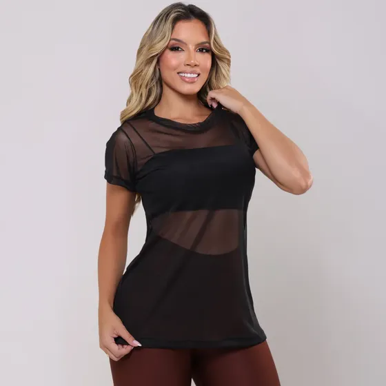 Blusa Feminina Moda Academia Transparente Fitness Tule Luxo